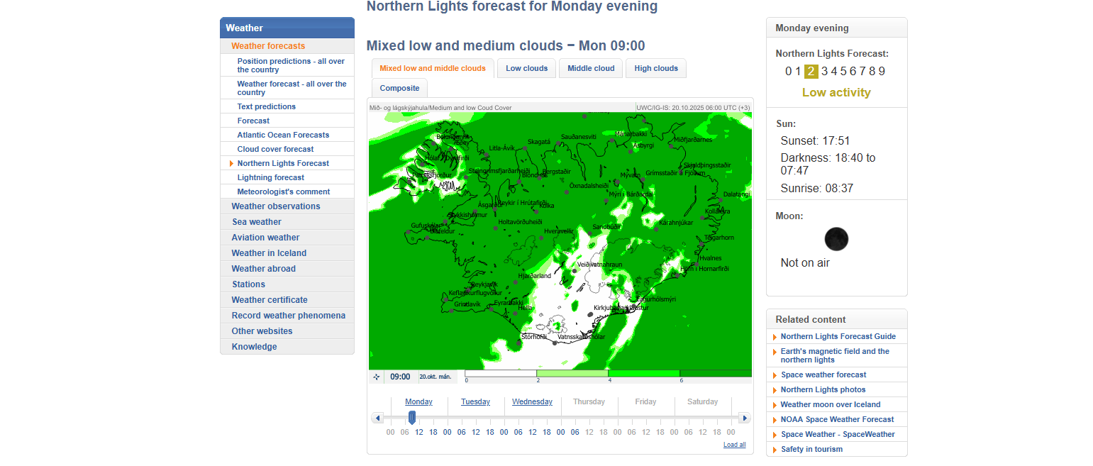 - Vedur.is — the official site of the Icelandic Meteorological Office, providing both aurora and cloud forecasts.